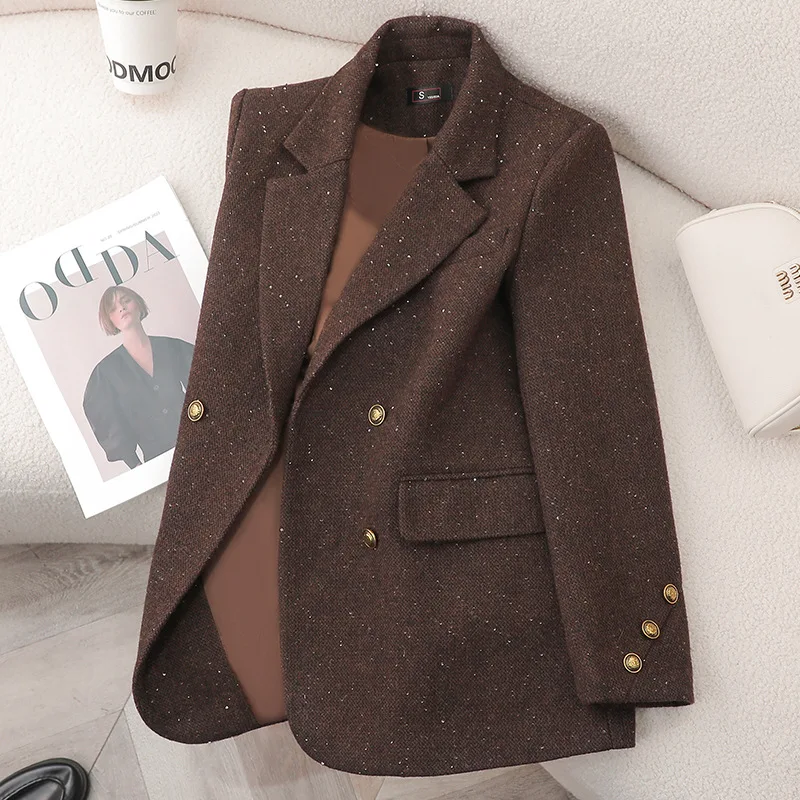 French Fashion Women Solid Long Sleeve Woolen Blazer Coat 2025 New Autumn Winter Ladies Elegant Double Breasted Jacket Versatile