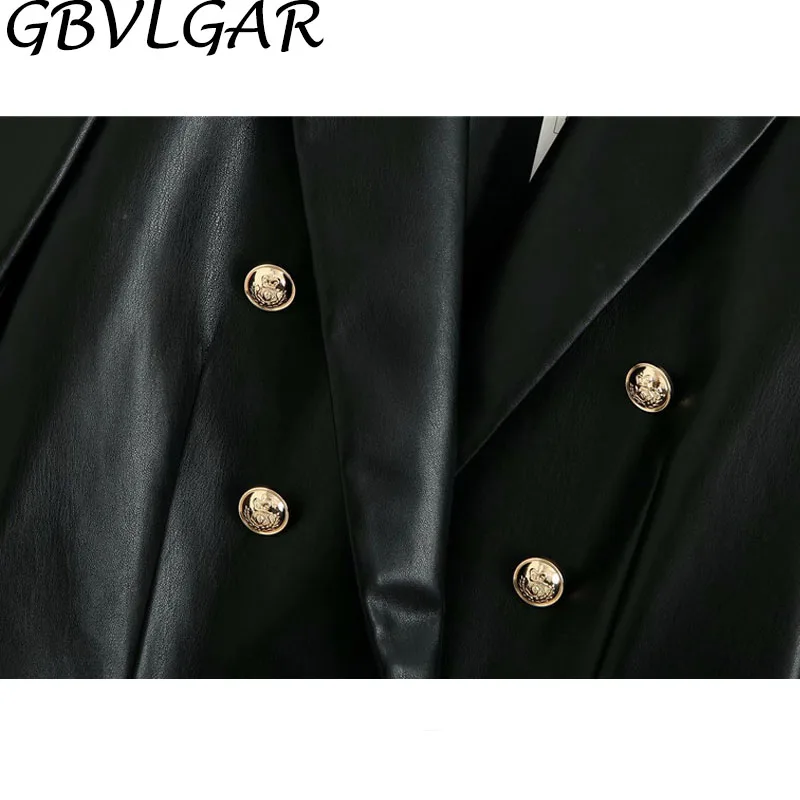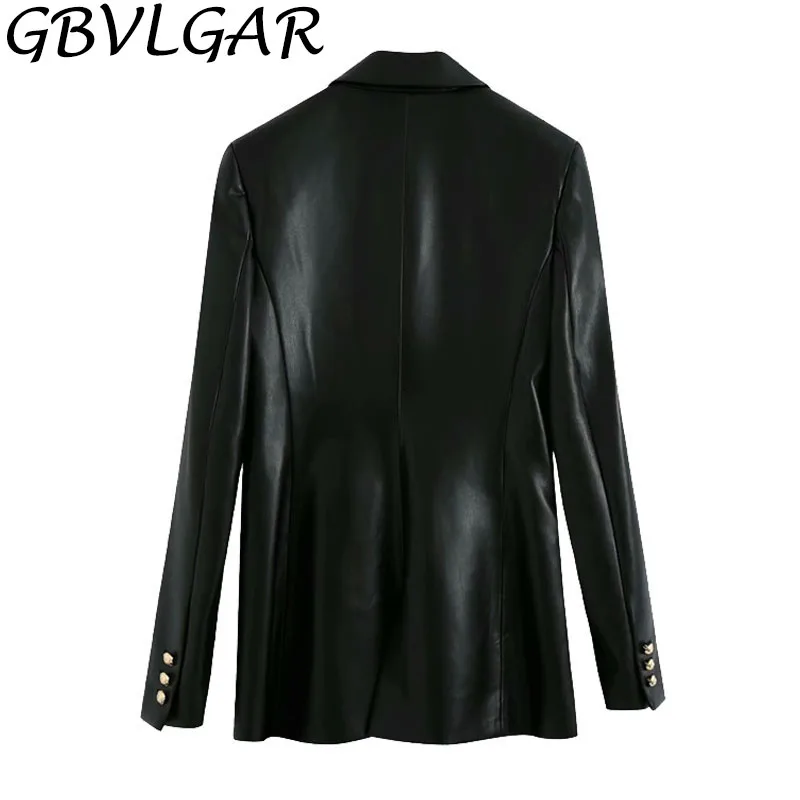 Women Fashion Notched Double Breasted PU Leather Blazers Coat Casual Straight Long Sleeve Back Vents Female Outerwear Chic Tops